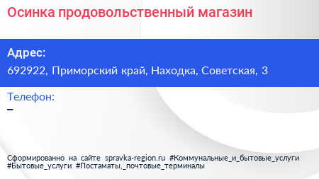 Осинка, продовольственный магазин по адресу 692922, Приморский край, Находка, Советская, 3 в дальнейшем Организация, размещена в следующих категориях: