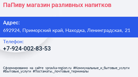ПаПиву, магазин разливных напитков по адресу 692924, Приморский край, Находка, Ленинградская, 21 в дальнейшем Организация, размещена в следующих категориях: