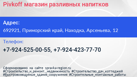 Pivkoff, магазин разливных напитков по адресу 692921, Приморский край, Находка, Арсеньева, 12 в дальнейшем Организация, размещена в следующих категориях: