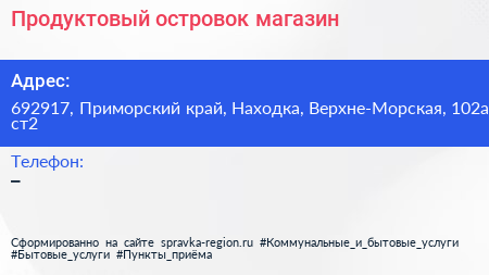 Продуктовый островок, магазин по адресу 692917, Приморский край, Находка, Верхне-Морская, 102а ст2 в дальнейшем Организация, размещена в следующих категориях: