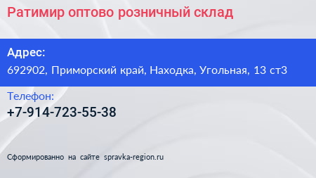 Ратимир, оптово-розничный склад по адресу 692902, Приморский край, Находка, Угольная, 13 ст3 в дальнейшем Организация, размещена в следующих категориях: