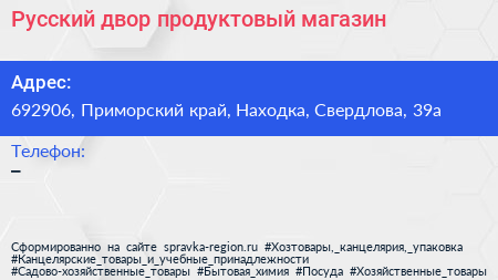 Русский двор, продуктовый магазин по адресу 692906, Приморский край, Находка, Свердлова, 39а в дальнейшем Организация, размещена в следующих категориях: