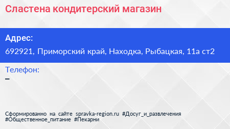 Сластена, кондитерский магазин по адресу 692921, Приморский край, Находка, Рыбацкая, 11а ст2 в дальнейшем Организация, размещена в следующих категориях: