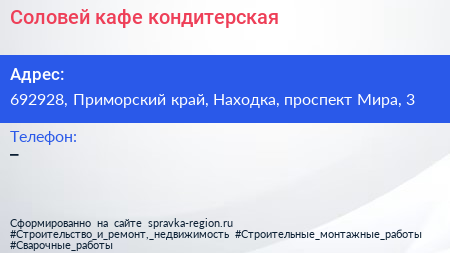 Соловей, кафе-кондитерская по адресу 692928, Приморский край, Находка, проспект Мира, 3 в дальнейшем Организация, размещена в следующих категориях: