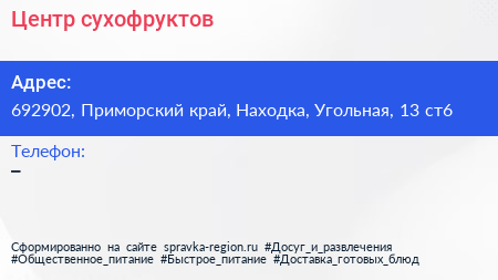Центр сухофруктов по адресу 692902, Приморский край, Находка, Угольная, 13 ст6 в дальнейшем Организация, размещена в следующих категориях: