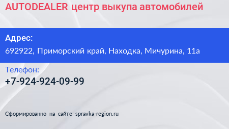 AUTODEALER, центр выкупа автомобилей по адресу 692922, Приморский край, Находка, Мичурина, 11а в дальнейшем Организация, размещена в следующих категориях: