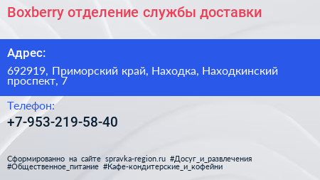 Boxberry, отделение службы доставки по адресу 692919, Приморский край, Находка, Находкинский проспект, 7 в дальнейшем Организация, размещена в следующих категориях: