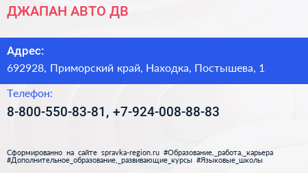 ДЖАПАН АВТО ДВ по адресу 692928, Приморский край, Находка, Постышева, 1 в дальнейшем Организация, размещена в следующих категориях: