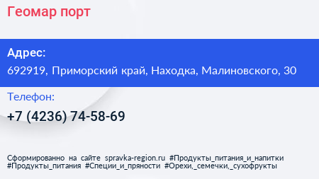 Геомар, порт по адресу 692919, Приморский край, Находка, Малиновского, 30 в дальнейшем Организация, размещена в следующих категориях: