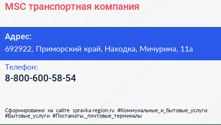 MSC, транспортная компания по адресу 692922, Приморский край, Находка, Мичурина, 11а в дальнейшем Организация, размещена в следующих категориях:
