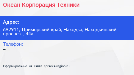 Океан Корпорация Техники по адресу 692911, Приморский край, Находка, Находкинский проспект, 44а в дальнейшем Организация, размещена в следующих категориях: