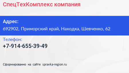 СпецТехКомплекс, компания по адресу 692902, Приморский край, Находка, Шевченко, 62 в дальнейшем Организация, размещена в следующих категориях:
