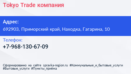 Tokyo-Trade, компания по адресу 692903, Приморский край, Находка, Гагарина, 10 в дальнейшем Организация, размещена в следующих категориях: