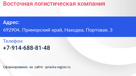 Восточная логистическая компания по адресу 692904, Приморский край, Находка, Портовая, 3 в дальнейшем Организация, размещена в следующих категориях: