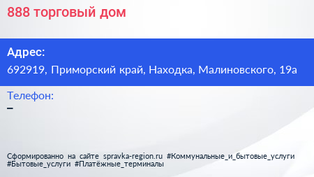 888, торговый дом по адресу 692919, Приморский край, Находка, Малиновского, 19а в дальнейшем Организация, размещена в следующих категориях: