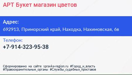 АРТ Букет, магазин цветов по адресу 692913, Приморский край, Находка, Нахимовская, 6в в дальнейшем Организация, размещена в следующих категориях: