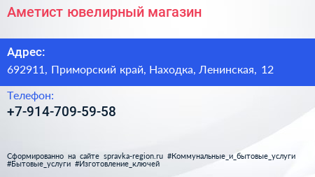 Аметист, ювелирный магазин по адресу 692911, Приморский край, Находка, Ленинская, 12 в дальнейшем Организация, размещена в следующих категориях: