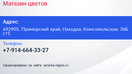 Магазин цветов по адресу 692905, Приморский край, Находка, Комсомольская, 36Б ст1 в дальнейшем Организация, размещена в следующих категориях: