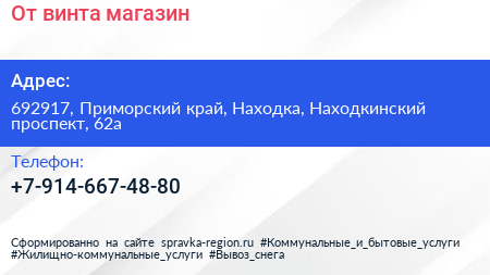 От винта, магазин по адресу 692917, Приморский край, Находка, Находкинский проспект, 62а в дальнейшем Организация, размещена в следующих категориях: