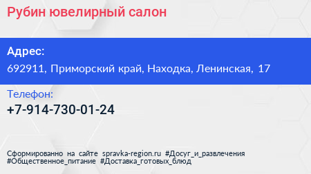 Рубин, ювелирный салон по адресу 692911, Приморский край, Находка, Ленинская, 17 в дальнейшем Организация, размещена в следующих категориях:
