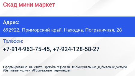 Скад, мини-маркет по адресу 692922, Приморский край, Находка, Пограничная, 28 в дальнейшем Организация, размещена в следующих категориях: