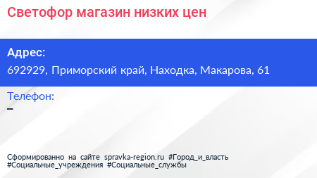 Светофор, магазин низких цен по адресу 692929, Приморский край, Находка, Макарова, 61 в дальнейшем Организация, размещена в следующих категориях: