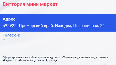 Виттория, мини-маркет по адресу 692922, Приморский край, Находка, Пограничная, 24 в дальнейшем Организация, размещена в следующих категориях: