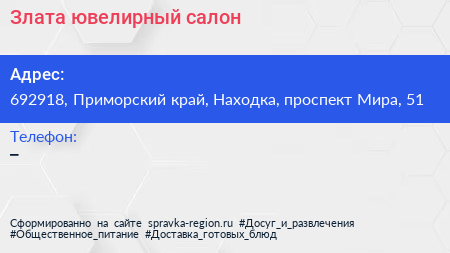 Злата, ювелирный салон по адресу 692918, Приморский край, Находка, проспект Мира, 51 в дальнейшем Организация, размещена в следующих категориях: