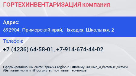 ГОРТЕХИНВЕНТАРИЗАЦИЯ, компания по адресу 692904, Приморский край, Находка, Школьная, 2 в дальнейшем Организация, размещена в следующих категориях: