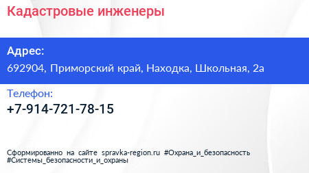 Кадастровые инженеры по адресу 692904, Приморский край, Находка, Школьная, 2а в дальнейшем Организация, размещена в следующих категориях: