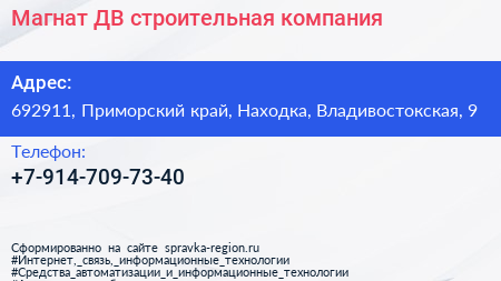 Магнат-ДВ, строительная компания по адресу 692911, Приморский край, Находка, Владивостокская, 9 в дальнейшем Организация, размещена в следующих категориях: