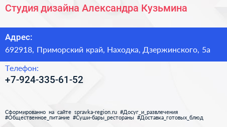 Студия дизайна Александра Кузьмина по адресу 692918, Приморский край, Находка, Дзержинского, 5а в дальнейшем Организация, размещена в следующих категориях: