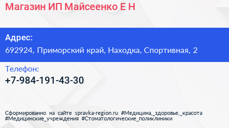 Магазин, ИП Майсеенко Е.Н. по адресу 692924, Приморский край, Находка, Спортивная, 2 в дальнейшем Организация, размещена в следующих категориях:
