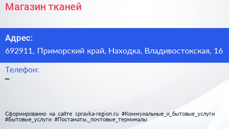 Магазин тканей по адресу 692911, Приморский край, Находка, Владивостокская, 16 в дальнейшем Организация, размещена в следующих категориях: