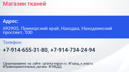 Магазин тканей по адресу 692903, Приморский край, Находка, Находкинский проспект, 100 в дальнейшем Организация, размещена в следующих категориях: