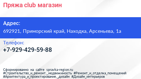Пряжа club, магазин по адресу 692921, Приморский край, Находка, Арсеньева, 1а в дальнейшем Организация, размещена в следующих категориях: