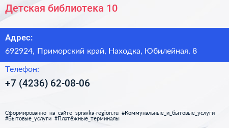 Детская библиотека №10 по адресу 692924, Приморский край, Находка, Юбилейная, 8 в дальнейшем Организация, размещена в следующих категориях: