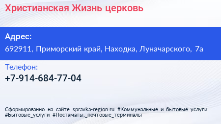 Христианская Жизнь, церковь по адресу 692911, Приморский край, Находка, Луначарского, 7а в дальнейшем Организация, размещена в следующих категориях: