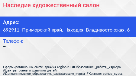 Наследие, художественный салон по адресу 692911, Приморский край, Находка, Владивостокская, 6 в дальнейшем Организация, размещена в следующих категориях: