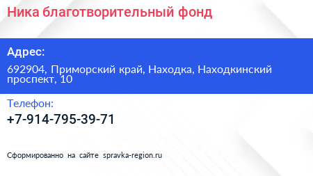 Ника, благотворительный фонд по адресу 692904, Приморский край, Находка, Находкинский проспект, 10 в дальнейшем Организация, размещена в следующих категориях: