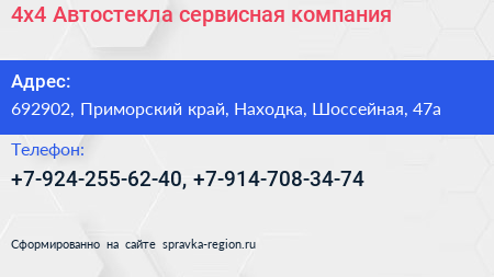 4х4 Автостекла, сервисная компания по адресу 692902, Приморский край, Находка, Шоссейная, 47а в дальнейшем Организация, размещена в следующих категориях: