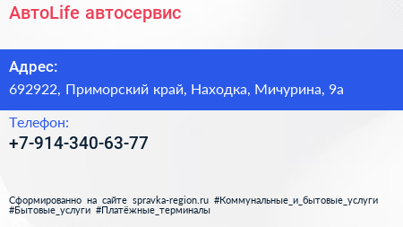 АвтоLife, автосервис по адресу 692922, Приморский край, Находка, Мичурина, 9а в дальнейшем Организация, размещена в следующих категориях: