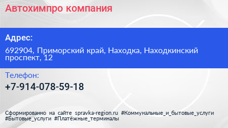 Автохимпро, компания по адресу 692904, Приморский край, Находка, Находкинский проспект, 12 в дальнейшем Организация, размещена в следующих категориях: