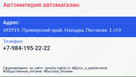Автоимперия, автомагазин по адресу 692919, Приморский край, Находка, Песчаная, 1 ст3 в дальнейшем Организация, размещена в следующих категориях: