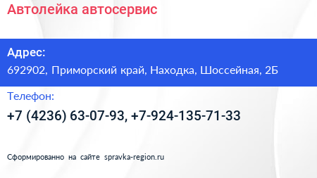 Автолейка, автосервис по адресу 692902, Приморский край, Находка, Шоссейная, 2Б в дальнейшем Организация, размещена в следующих категориях: