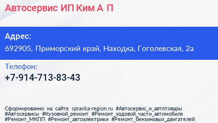 Автосервис, ИП Ким А.П. по адресу 692905, Приморский край, Находка, Гоголевская, 2а в дальнейшем Организация, размещена в следующих категориях: