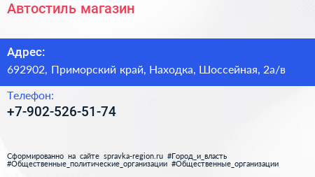 Автостиль, магазин по адресу 692902, Приморский край, Находка, Шоссейная, 2а/в в дальнейшем Организация, размещена в следующих категориях: