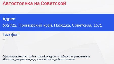 Автостоянка на Советской по адресу 692922, Приморский край, Находка, Советская, 15/1 в дальнейшем Организация, размещена в следующих категориях: