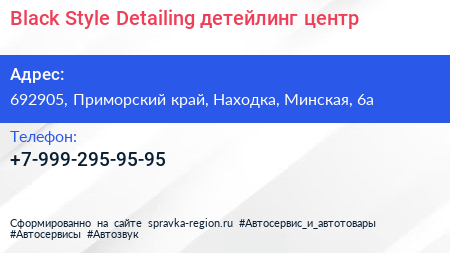 Black Style Detailing, детейлинг-центр по адресу 692905, Приморский край, Находка, Минская, 6а в дальнейшем Организация, размещена в следующих категориях: