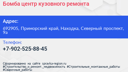 Бомба, центр кузовного ремонта по адресу 692905, Приморский край, Находка, Северный проспект, 9а в дальнейшем Организация, размещена в следующих категориях: